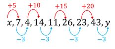 , 7, 4, 14, 11, 26, 23, 43,