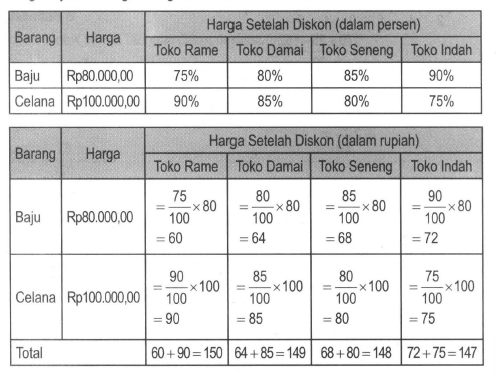 Ada empat toko menjual jenis barang yang sama. Daftar harga barang dan diskon seperti pada tabel.
