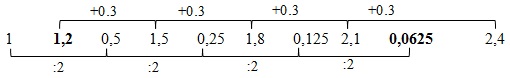 1; …; 0,5 ; 1,5; 0,25; 1,8; 0,125; 2,1; …; 2,4.