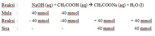 100 mL larutan CH3COOH 0,4 M dicampur dengan 100 mL larutan NaOH 0,4 M. Jika Ka CH3COOH = 2,0 x 10-5, maka pH larutan tersebut adalah...