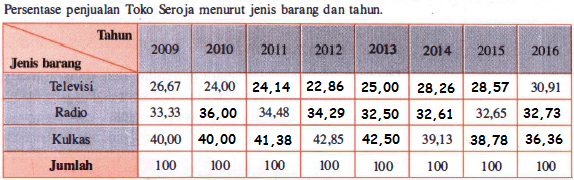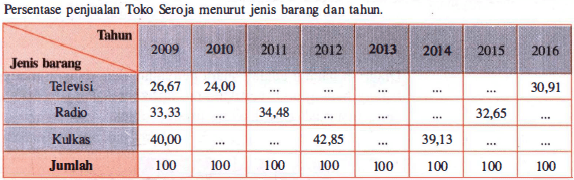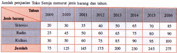 16. Jumlah penjualan di Toko Seroja menurut jenis barang dan tahun (dalam jutaan rupiah) diperlihatkan seperti tabel di bawah.
