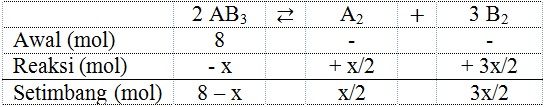 8 mol gas dimasukkan ke dalam wadah ukuran . Gas tersebut terdisosiasi menurut reaksi: . pada kesetimbangan, terdapat . Konstanta kesetimbangan dari reaksi tersebut adalah … .