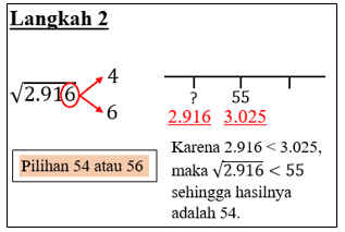 Lalu, kita gunakan bantuan bilangan berpangkat yang satuannya 5 dengan menguadratkan bilangan 55 karena 55 berada di antara 54 dan 56.