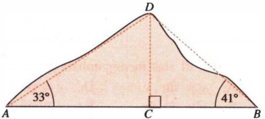 A dan B terletak di tanah datar dan berjarak 1.500 m, sudut elevasi dari A dan B ke puncak gunung (D) berturut-turut adalah dan .