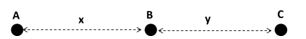 A dan C adalah pusat-pusat dua bola kecil yang bermassa 4m dan 9m. Besar kuat medan gravitasi kedua bola ini di B bernilai sama. Nilai perbandingan x terhadap y adalah ….