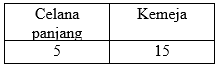 Abay memiliki koleksi 5 macam celana panjang dengan warna berbeda dan 15 kemeja dengan corak berbeda. Banyak cara Abay berpakaian dengan penampilan berbeda adalah....