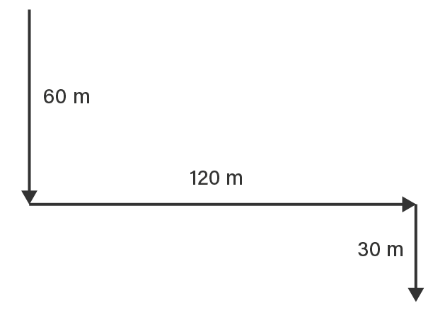 Abi berjalan dari rumahnya ke perpustaan kota ke arah selatan sejauh 60 m, kemudian berbelok ke arah timur sejauh 120 m, dan berbelok ke arah selatan sejauh 30 m. Waktu yang diperlukan Abi untuk sampai di perpustakaan kota adalah 5 menit. Hitunglah jarak tempuh Abi dari rumah ke perpustakaan!
