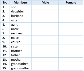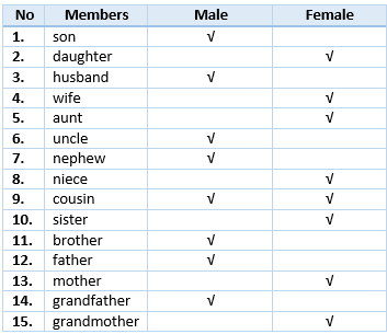 Are the family members female or male? Check in the right columns. Then read the words aloud.