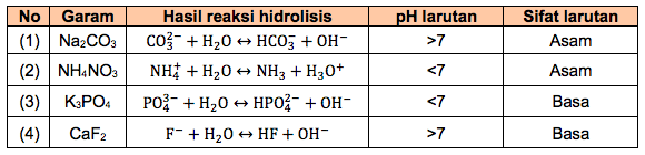 Ada 3 reaksi yang terjadi pada hidrolisis garam yaitu hidrolisis sempurna, hidrolisis sebagian, dan tidak terhidrolisis Hidrolisis sempurna terjadi dari senvawa asam lemah dan basa lemah, hidrolisis sebagian terjadi dari senyawa basa kuat dan asam lemah, reaksi yang tidak terhidrolisis terjadi dari asam kuat dan basa kuat, Pengujian sifat garam dilakukan dengan kertas lakmus sebagai berikut: