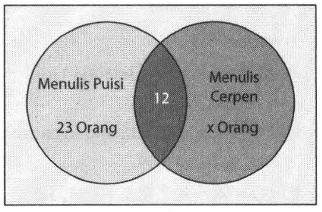 Ada 40 peserta yang ikut lomba. Lomba baca puisi diikuti oleh 23 orang, lomba baca puisi dan menulis cerpen diikuti oleh 12 orang. Banyaknya peserta yang mengikuti lomba menulis cerpen adalah...