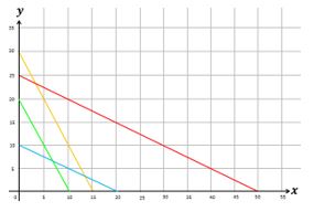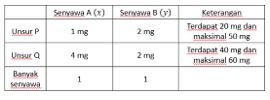 Adi melakukan percobaan kimia pada dua senyawa A dan B yang masing-masing senyawa tersebut akan ditambahkan unsur P dan Q. Banyaknya unsur P yang ingin ditambahkan ke dalam senyawa A adalah 1 mg dan ke dalam senyawa B adalah 2 mg. Sedangkan banyaknya unsur Q yang ingin ditambahkan ke dalam senyawa A adalah 4 mg dan ke dalam senyawa B adalah 2 mg. Diketahui stok unsur P terdapat sebanyak 0,02 gram dan dapat ditambahkan hingga 0,05 gram, sedangkan stok unsur Q terdapat sebanyak 0,04 gram dan dapat ditambahkan hingga 0,06 gram. Massa maksimum senyawa A dan B adalah .... gram