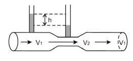 Luas penampang tabung di bagian yang lebar dan sempit masing-masing 12 cm2 dan 8 cm2. Beda tinggi permukaan air pada tabung pengukur beda tekanan ialah h = 25 cm maka kecepatan air yang keluar pipa venturimeter adalah .... m/s.