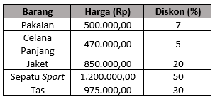 Akhir bulan ini, Shinta ingin membeli beberapa barang karena sedang banyak diskon. Berikut ini daftar barang yang mendapat diskon.