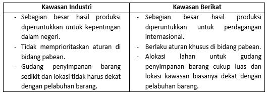 Akibat kurangnya lahan untuk pembangunan industri, maka terbentuklah pengelompokan/pemusatan industri di suatu tempat yang sama. Aglomerasi industri dapat berupa kawasan industri dan kawasan berikat. Perbedaan antara kawasan industri dan kawasan berikat adalah ....