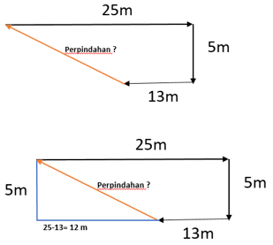 Ali berjalan menuju ke timur sejauh 25 meter, lalu ke selatan sejauh 5 meter, dan ke barat sejauh 13 meter. Perpindahan Ali sebesar ….