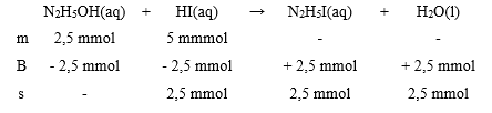 Aliva memiliki 25 mL larutan hidrazin () 0,1 M yang dititrasi oleh larutan asam iodida berlebih, yaitu 50 mL dengan konsentrasi 0,1 M. pH larutan hidrazin sebelum dan setelah dititrasi adalah .... ()