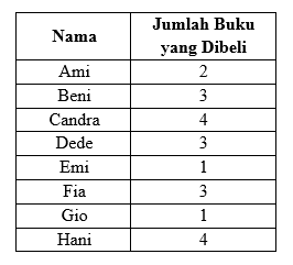 Ami dan teman-temannya membeli buku. Berikut ini jumlah buku yang dibeli oleh Ami dan teman-temannya :