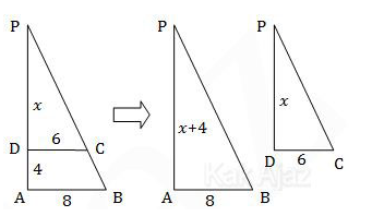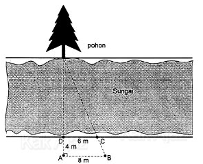 Amir ingin mengetahui lebar sungai seperti pada gambar berikut. Di samping sungai terdapat sebuah pohon. Untuk itu dia menancapkan tongkat pada posisi A, B, C, dan D dengan ukuran seperti pada gambar.