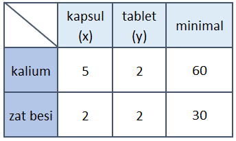 Anak balita dianjurkan dokter anak untuk mengonsumsi kalium dan zat besi sedikitnya masing-masing 60 gram dan 30 gram. Sebuah kapsul mengandung 5 gram kalium dan 2 gram zat besi, sedangkan sebuah tablet mengandung 2 gram kalium dan 2 gram zat besi. Jika harga sebuah kapsul Rp11 .000,00 dan sebuah tablet Rp8.000,00, biaya minimum yang harus dikeluarkan untuk memenuhi gizi si anak balita itu adalah ....