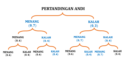 Andi dan Doni bermain catur bersama. Peluang menang perdana jika di pertandingan sebelumnya tidak menang adalah 0,7 untuk Andi dan 0,3 untuk Doni. Peluang menang di ronde berikutnya setelah menang di ronde sebelumnya adalah 0,6 untuk Andi dan 0,3 untuk Doni. Peluang Andi menang tepat satu kali dari 3 ronde adalah ….
