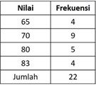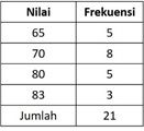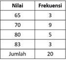 Andi diminta ibu guru untuk membuat tabel dengan data 80, 70, 70, 83, 80, 70, 65, 80, 65, 70, 70, 70, 83, 80, 83, 70, 65, 65, 70, 80. Tabel yang sesuai dengan data tersebut adalah ….