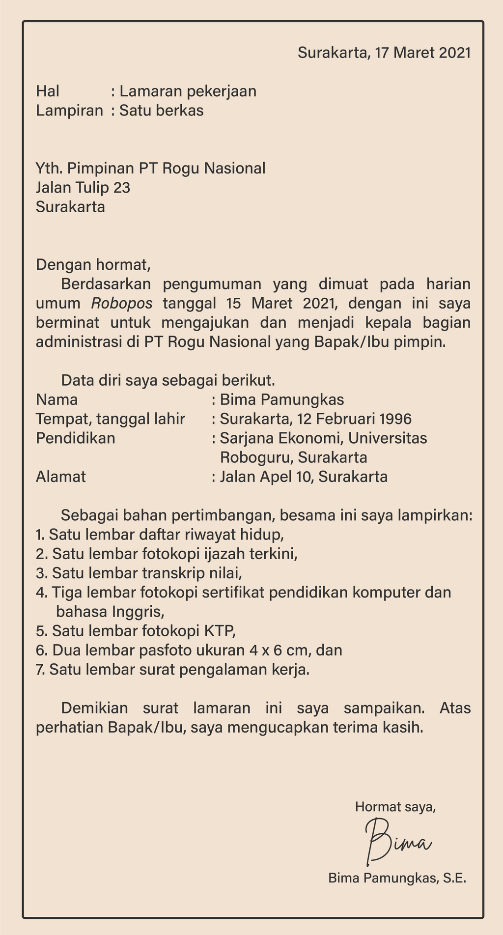 Perhatikan contoh surat lamaran pekerjaan berikut!