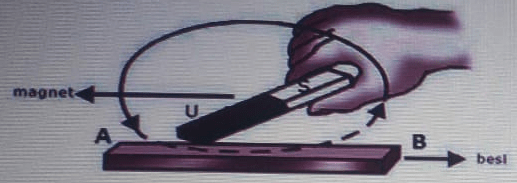 Apabila batang besi AB digosok oleh magnet dengan arah seperti pada gambar, maka kutub magnet pada titik A dan B adalah ...