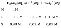 Asam karbonat, dapat mengalami ionisasi sesuai reaksi berikut: