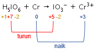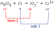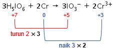 Langkah 3: menyamakan jumlah unsur yang mengalami perubahan biloks, yaitu unsur I dan Cr.