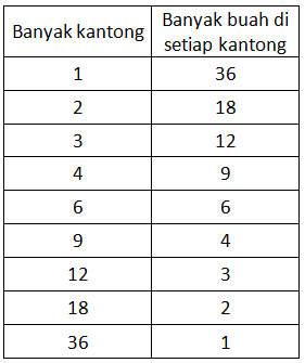 Ayah membeli 36 apel yang dikemas dalam beberapa kantong sama banyak. Tentukan kemungkinan banyak kantong dan banyak apel di setiap kantong!