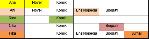 Ayah membelikan buku untuk anaknya sebagai hadiah karena telah mendapatkan peringkat di kelas pada semester ganjil. Ayah membelikan buku sesuai dengan buku kesukaan anaknya masing-masing. Di dalam toko buku yang ayah kunjungi hanya tersedia 1 buah buku untuk setiap jenisnya. Ayah kemudian membelinya. Berikut ini merupakan daftar buku kesukaan anak-anak ayah. Ana menyukai novel dan komik. Ani menyukai buku ensiklopedia, novel, komik dan biografi. Rina menyukai komik saja. Cika menyukai komik dan biografi. Fika menyukai buku ensiklopedia, komik, biografi, dan jurnal.