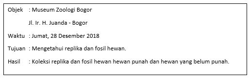 Pada hari Jumat, 28 Desember 2018, kami mengunjungi Museum Zoologi Bogor. Museum Zoologi Bogor berlokasi di Jl. Ir. H. Juanda, Bogor. Kegiaatan ini dilakukan untuk mengenal replika dan fosil hewan. Berdasarkan hasil pengamatan, di dalam Museum Zoologi Bogor terdapat koleksi berbagai macam replika dan fosil hewan yang sudah punah mapun yang belum punah