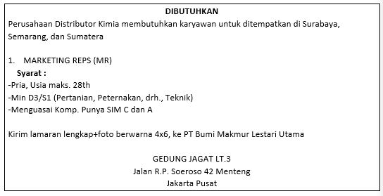 Berhubungan dengan iklan Bapak dalam surat kabar Kompas, 24 Juni 2019, dengan ini saya mengajukan lamaran pekerjaan sebagai Marketing Reps (MR).