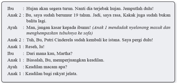 Watak anak 1 pada penggalan dialog di atas adalah….