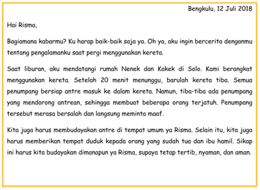 penulis surat ingin menceritakan pengalaman saat pergi menggunakan kereta kepada Risma