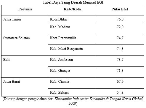 (1) Lembaga KPPOD bekerja sama dengan USAID dan The Asian Foundation (TAF) mengadakan survei daya saing daerah berdasar level economic governance. (2) Survei tersebut dilakukan pada 243 kabupaten/kota yang tersebar pada 15 provinsi Indonesia. (3) Indikator kinerja yang digunakan dalam survei ini adalah manajemen infrastruktur, aksesibilitas dan kepastian lahan, serta program pengembangan sektor swasta. (4) Di samping itu, terdapat empat indikator kinerja lainnya, yakni hubungan antara pemerintah daerah dan sektor bisnis, biaya transaksi, integritas dan resolusi konflik, serta kualitas dari peraturan daerah. (5) Berdasarkan tujuh komponen tersebut, disusunlah indeks tata kelola ekonomi/economic governance index (EGI). (6) Pembobotan untuk setiap indeks disusun menurut persentase perusahaan yang mamandang indeks tersebut sebagai masalah utama yang memengaruhi lingkungan bisnis. (7) Hasilnya adalah empat permasalahan utama yang terdapat dalam pengelolaan ekonomi lokal di Indonesia terdiri atas permasalahan manajemen infrastruktur, pembangunan sektor swasta, aksesibilitas dan kepastian lahan, hubungan pemda dan sektor bisnis. (8) Setiap permasalahan ini diberi bobot secara berurutan, yaitu 35,5%, 14,8%, dan 14%. (9) Berdasarkan hasil survei, terdapat empat provinsi yang konsisten dalam memperoleh nilai EGI. (10) Keempat provinsi itu itu dengan indeks tata kelolanya dapat diamati pada tabel berikut.