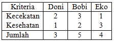Eko paling sehat, paling rajin, tetapi masih kalah dari Doni dalam hal mengatasi masalah dan masih kalah dari Bobi dalam hal kepemimpinan.
