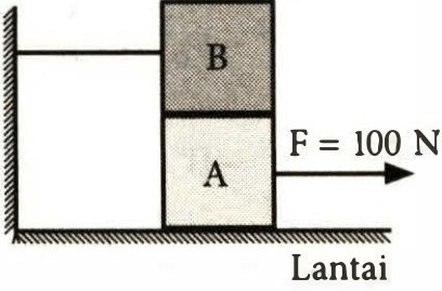 Balok A (massa = 1 kg) dan B (massa = 2 kg) disusun seperti pada gambar di bawah! (g = 10 ms-2). Bila koefisien gesekan lantai (µL) = 2 kali koefisien gesekan balok B, balok A tepat akan bergerak dengan percepatan 40 ms-2. Maka perbandingan gaya gesekan antara balok A dan lantai dengan balok A dan B adalah ...
