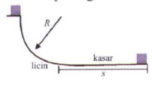 Balok jatuh bebas dari lintasan pada gambar sampai jarak s. Jika koefisien gesekan kinetis antara balok dan bidang kasar 0,2., perbandingan jari- jari (R) bidang seperempat lingkaran dengan jarak tempuh s adalah