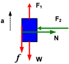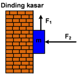 Balok m bermassa 10 kg menempel pada dinding kasar dengan koefisien gesekan kinetis 0,1. Balok mendapat gaya horizontal F2 = 50 N dan gaya vertikal F1.