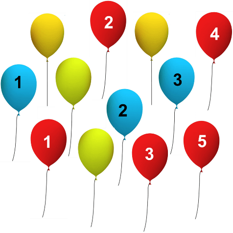 Balon merah dan balon biru masing-masing berjumlah ... dan ... buah.