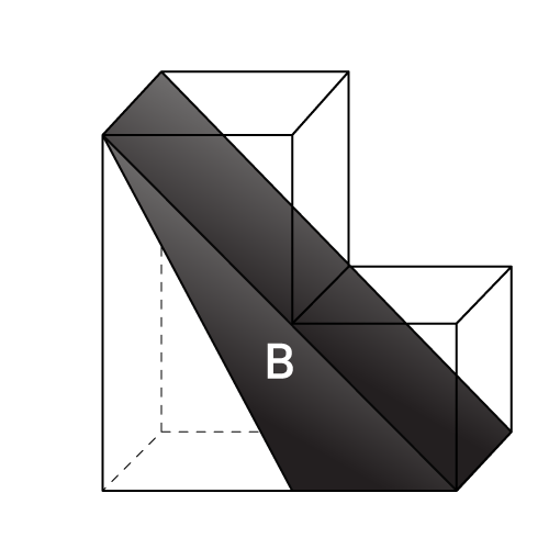 Bangun ruang dibentuk dari 3 kubus kosong, masing-masing dengan rusuk 2 cm. Jika ada bangun prisma B pejal menempati ruang tersebut, maka volume ruang yang tersisa sama dengan ….