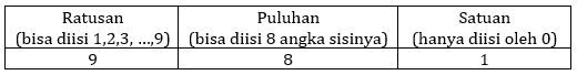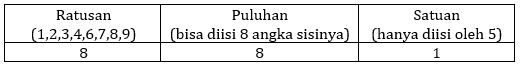 Banyaknya bilangan tiga digit berbeda yang disusun dari angka-angka 0, 1, 2, …, 9 dan habis dibagi oleh 5 adalah ….