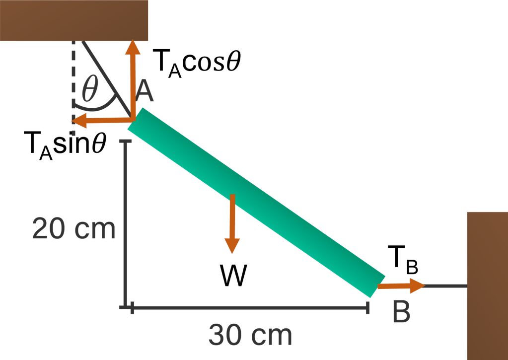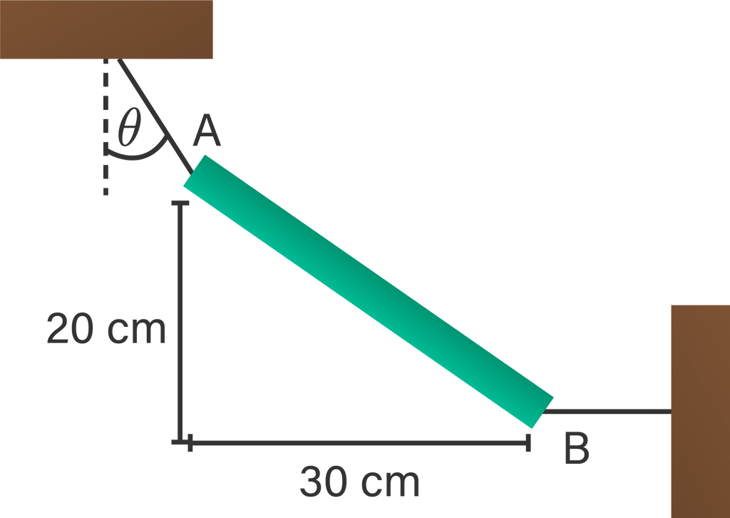 Batang homogen bermassa m diikat dengan tali-tali A dan B setimbang pada posisi seperti gambar di bawah dengan tali B horizontal. Nilai adalah ...