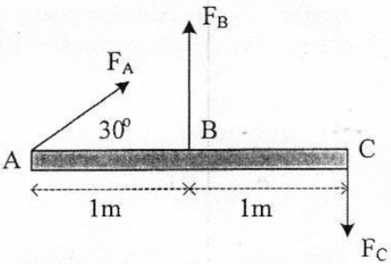 Batang homogen tak bermassa sepanjang 2m dipengaruhi gaya seperti gambar. Besar dan . Momen gaya yang bekerja terhadap titik A adalah....