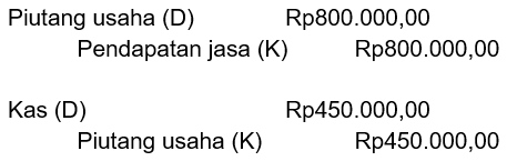 Bayu elektronik menyelesaikan servis laptop sebesar Rp800.000,00. Dua hari kemudian diterima angsuran piutang usaha dari pelanggan sebesar Rp450.000,00. Saldo akun piutang usaha dalam neraca saldo Bayu elektronik sebesar ....