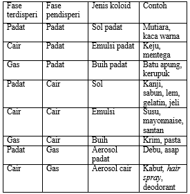 Beberapa contoh koloid dalam kehidupan sehari-hari adalah sebagai berikut: