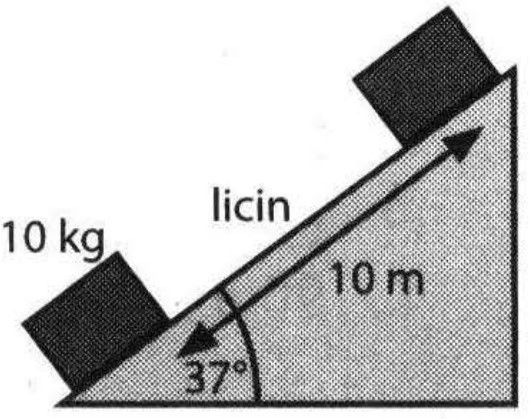 Benda 10 kg hendak digeser melalui permukaan bidang miring yang licin seperti gambar berikut!