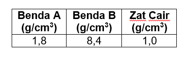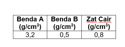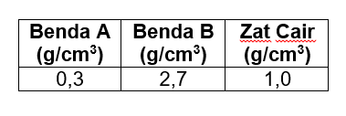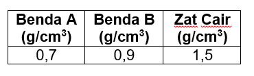 Massa jenis zat cair, benda A dan B yang memungkinkan adalah ....(UN 2015)
