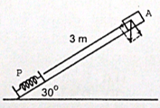 Benda A yang memiliki massa 0,5 kg dan mula mula diam meluncur 3 m pada papan licin yang membentuk sudut 30o dengan bidang datar. Kemudian benda A menumbukkan pegas P yang salah satu ujungnya tertancap kuat pada ujung papan. Jika konstanta pegas 900 N/m, maka pemendekan maksimum pegas adalah ….